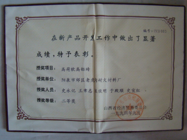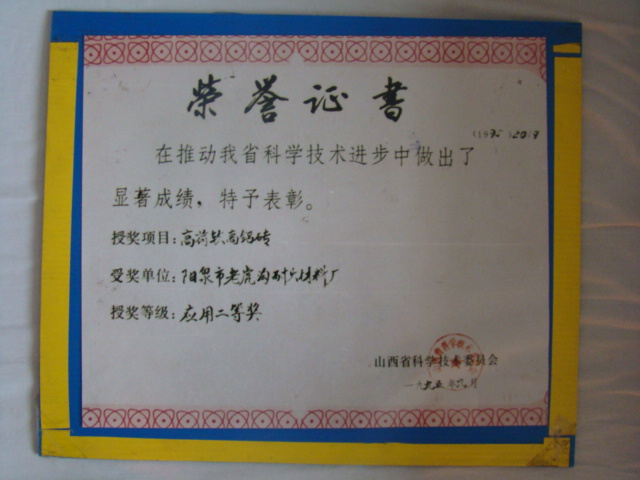 熱風爐用低蠕變高鋁磚、高荷軟高鋁磚獲省科技進步二等獎,微膨脹高鋁磚列入火炬計劃項目,炭素焙燒爐用特種高鋁磚已批準國家專利